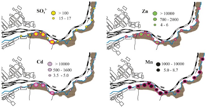 Отмечено неравномерное распределение аномалий химических элементов в воде Малой Талмовой. Установлено, что тяжёлые частицы (сульфиды и их срастания) оседают в реке в непосредственной близости от отвала, а лёгкие разносятся водным потоком вниз по течению.