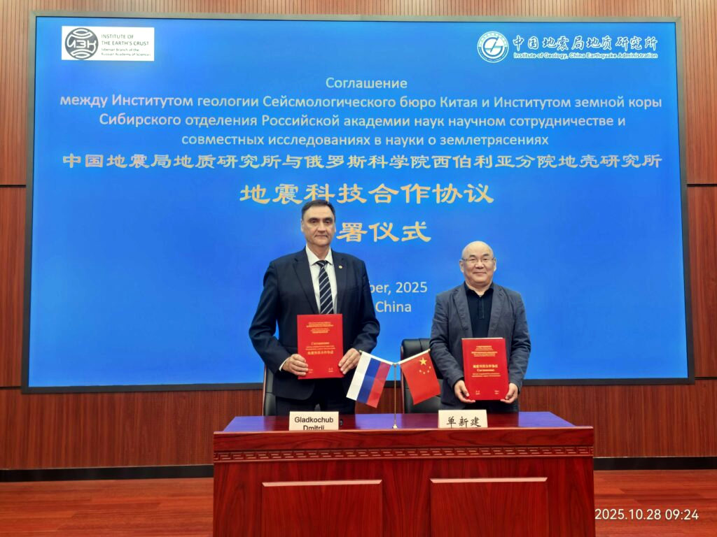 С 26 октября по 1 ноября 2025 года делегация Института земной коры СО РАН посетила Институт геологии Сейсмологического бюро Китая (г. Пекин). Ключевым событием визита стало подписание соглашения о научном сотрудничестве в области сейсмических исследований. Документ закрепил намерения институтов развивать совместные проекты и обмениваться опытом в изучении сейсмологических процессов и связанных с ними геологических явлений.